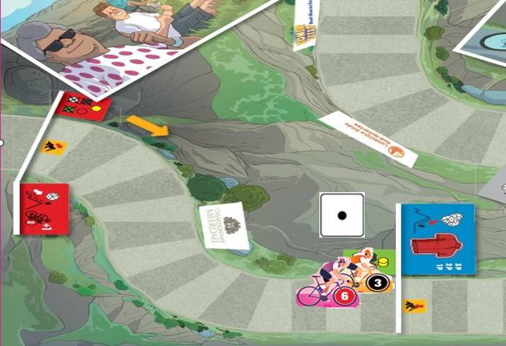 For the riders of the other teams, you play as in Cyclo-Starter Solo (including the pit rule and the use of chance cards), but with every roll, the rider for whom the roll is made moves one space forward. This means that a climber from another team moves two spaces forward during a climb.