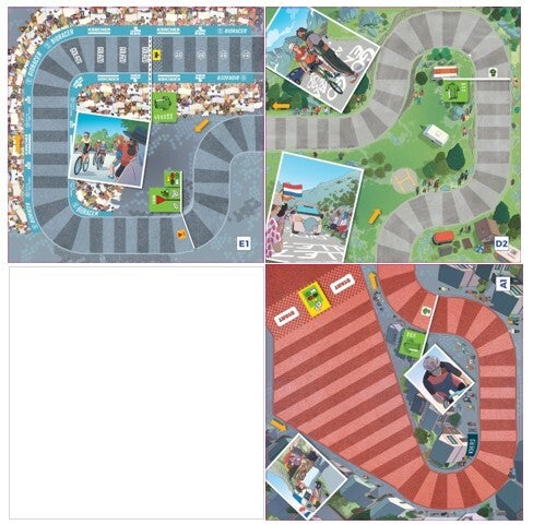 Gebruik de borden in deze volgorde: A1-D2-A2-E1 De helling van A2 is een zijn kasseihelling zoals in een Vlaamse klassieker, dus 1 dobbelsteen. Je moet van zodra alle renners van bord A1 af zijn het bord omkeren en laten aansluiten op D2.