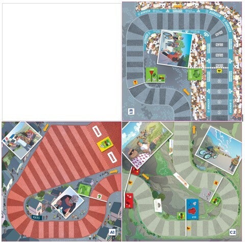 Gebruik de borden in deze volgorde: A1-C1-E1 De hellingen van C1 zijn kasseihellingen zoals in een Vlaamse klassieker, dus 1 dobbelsteen