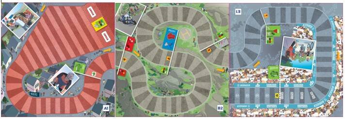 Gebruik de borden in deze volgorde: A1-C1-E1 De hellingen van C1 zijn kasseihellingen zoals in een Vlaamse klassieker, dus 1 dobbelsteen